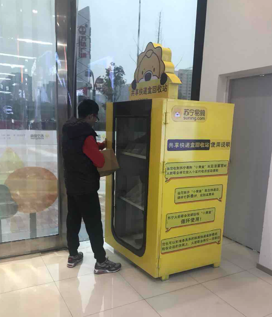 家住杭州的吴先生,在苏宁易购年货节抢购了一部手机。与以往不同的是,他在小区自提柜取出了共享快递盒包装的新手机。而自提柜附近设置了一个包装回收站,吴先生将共享快递盒折叠好,直接放在了回收站里。