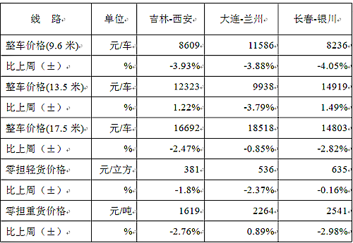 各车型指数环比均有不同程度回落,整车指数回落幅度明显高于零担指数。在零担指数中,零担轻货指数回落幅度高于零担重货指数。其中,整车指数为1012.0点,环比回落1.5%,比年初回落8.3%;零担轻货指数为1223.5点,环比回落0.47%;零担重货指数为1043.4点,环比回落0.31%。