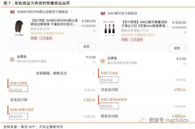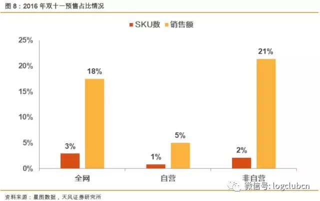 因此定金将会对双十一当天的交易额形成一定的膨胀作用,膨胀的比例多少呢?从2016年的结果来看,尽管采用预售手段进行促销的SKU比例不高,全网只有3%,但由于预售商品多为“大件”,比如今年的彩电、彩妆等商品,预售商品销售额占全网的比重达到了18%。