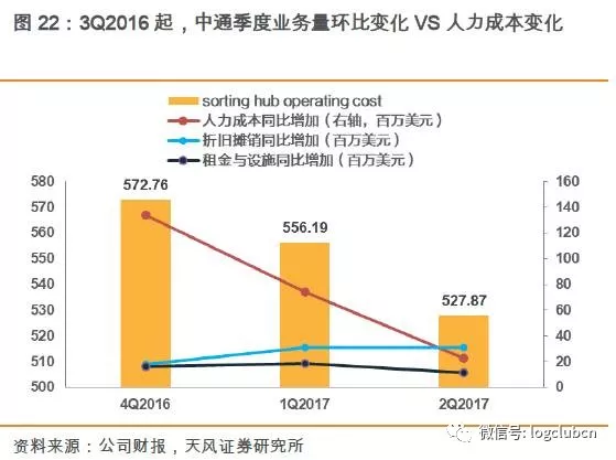 2) 人力成本的变化:我们继续向下拆解分拣中心成本(Sorting hub operating cost),4Q2016开始公司即公布当季的分拣中心成本金额,以及各个子项目的成本增长情况。从去年四季度开始,分拣中心的操作成本就是逐季下降,而公司季报内给出的人力、折旧与租金成本同比增加情况来看,人力的增加正在快速减弱,譬如今年的二季度只比去年同期增加2.27亿美金,而折旧、租金的增加则整体较为平缓。