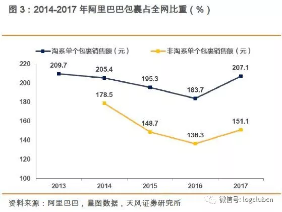 我们计算了淘系与非淘系平台上,单个包裹所对应的销售金额。淘系件的该指标在经历了过去3-4年10%的累计下滑之后,在今年获得了强劲的反弹,207.1元/件的平均消费金额,几乎接近了2013年时的水平,同样地,非淘系包裹的单位消费金额也有每件15元左右的反弹。