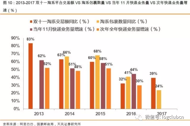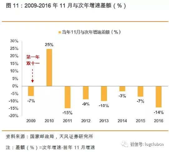 3) 首年11月增速与次年全年业务量增速,基本上次年的增速都会弱于上年十一月的数字。尤其2013年之后,行业整体增速下滑,叠加11月的电商嘉年华活动开始对前后一段时间的需求进行透支,导致11月的单月增速高于次年全年成为常态。