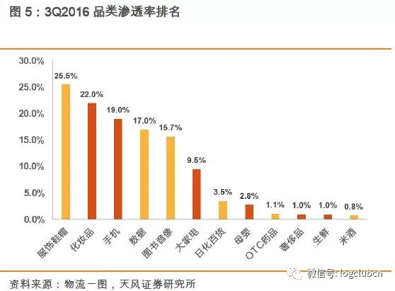 单个包裹对应消费金额上涨的原因,一方面来自于商品品类的变化:双十一的重点监控品类中,大家电、手机、个人护理这样的高均值消费位居前三;而从3Q2016电商行业渗透率(我们能够拿到的最新数字)来看,化妆品、手机、大家电、母婴甚至奢侈品的渗透率都十分亮眼。