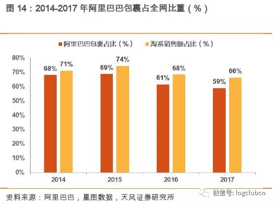 对比两个口径的数字,增速不同导致了阿里巴巴占据全网包裹比例的变迁: