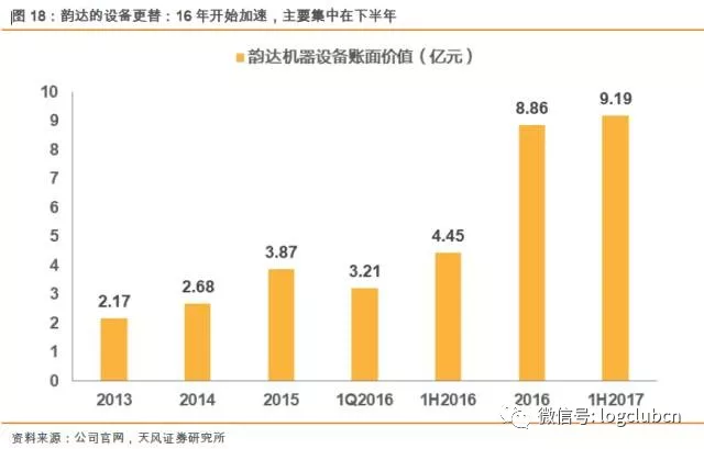 而在上市公司层面,2016年后在资本加持下,快递公司也开始迅速上马自动化分拣设备,根据中通16年财报,10个分拣中心配备12套自动化分拣设备,其中四季度旺季安装7套,这符合快递行业“旺季扩张、来年消化”的成长特征。同理,我们参考近几年增速较快的韵达,资产负债表内机器设备的账面价值也是在上市当年(16年)开始升高(韵达的募投定增发行与2017年,可能存在提前自行投入的现象),而主要交付集中在16的下半年,体现出明显的“为旺季预备”特征。
