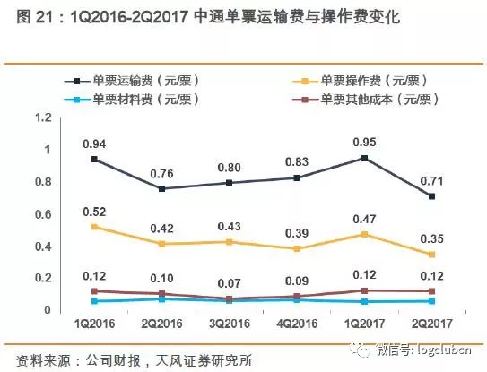1) 单位成本的变化:中通的主要成本包括了运输、操作、材料和其他共计四项,其中运输和操作为核心,是控制成本最关键的环节。1Q2016年开始,中通的单票操作成本进入了稳步下行通道,投用7条自动分拣线的4Q更是控制得当,这也使得中通成为少数四季度单票毛利不降反升的快递公司;