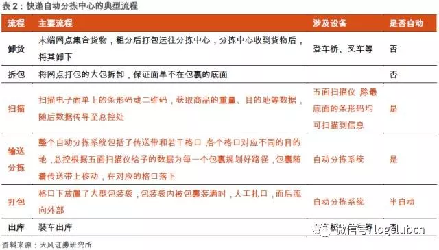 站在快递分拣中心视角,尽管从商品的尺寸、体积等来看远比其他的场景复杂,但快进快出的特点决定了分拣中心不存在上架、存储、下架等流程,加上绝大部分都是数公斤以下的轻小件,快递对货架、穿梭车、高空作业平台、叉车等设备的需求几乎没有。在一个典型的快递自动分拣场景中,主要流程和所用到的设备下表中总结的,而其中的核心环节在于我们高亮出的扫描、输送分拣以及打包。
