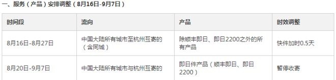 圆通表示: 8月20日至9月6日,全国各地至杭州互寄(含同城)的快件将有所调整,具体如下: