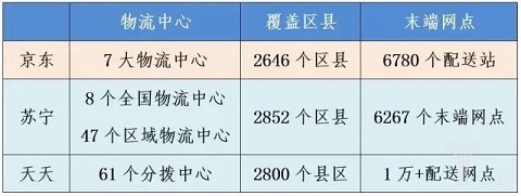 通过对比可见,目前苏宁仅在末端网点方面少于京东,在物流中心和区县覆盖率方面略胜一筹,“苏宁+天天”则大大超过竞争对手,具有打造国内零售最大的自营物流企业的基础。