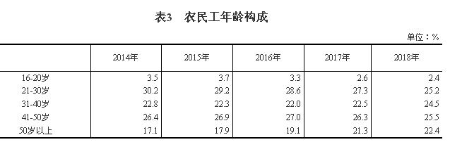 ——青年农民工数量在减少。从2011到2018年,全国16~20岁的农民工从1593万减少到692万,减少了57.6%;21~30岁的农民工从8266万减少到7267万,减少了12.1%。近5年来,50岁以上农民工的增加量超过了全部农民工的增加量。换句话说,50岁及以下农民工的数量,近5年不增反减。
