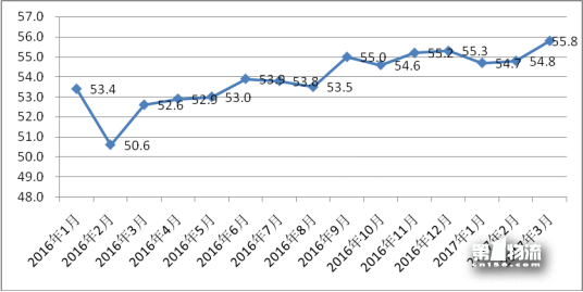 图、2016年1月-2017年3月福建省物流业景气指数(LPI)走势图