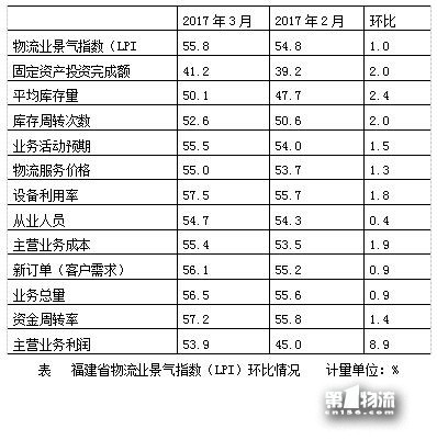 随着企业生产建设活动的好转,全省物流需求自2月份起回升,3月份升至55.0%以上的高位,3月份福建省物流业景气指数(LPI)为55.8%,较上月提升1.0个百分点;各分项指数也全面回升,其中主营业务利润指数回升超过8.0个百分点,行业保持良好运行态势。