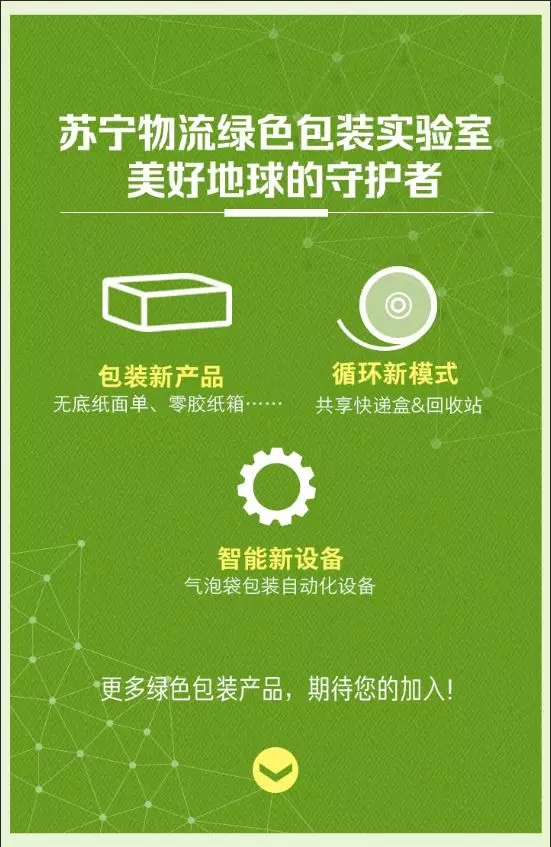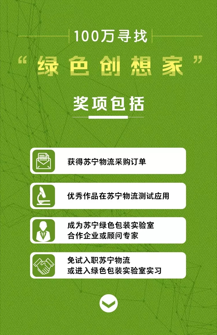 苏宁物流联合多家合作伙伴共同发起首届“绿色共享”包装设计大赛,和物流行业专业人士以及有责任有担当的环保人士一起,共同关注绿色包装,践行环保理念,通过包装新产品、新技术、新运作模式为电商物流行业注入新的活力和力量。