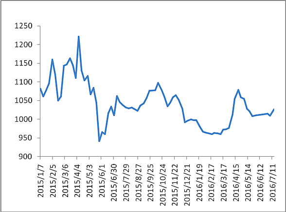 本周(2016年7月11日~7月15日),由中国物流与采购联合会和林安物流集团联合调查的中国公路物流运价指数1027.4点,比上周回升1.3%,但比上年同期下降1.8%。