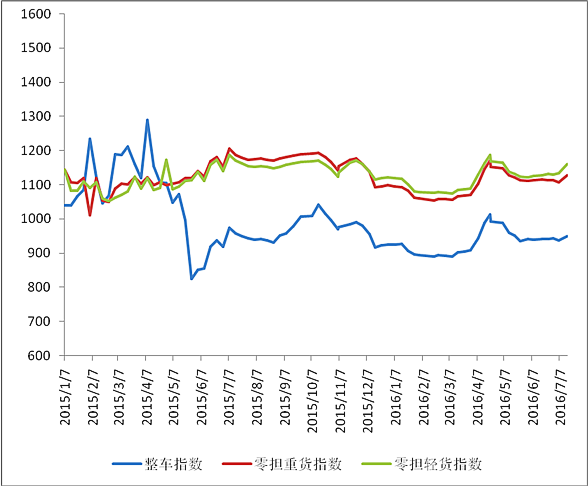 各车型指数均有所回升,其中零担指数回升幅度高于整车指数,零担轻货指数回升幅度高于零担重货指数。本周,整车指数为950.2点,环比回升1.4%,比年初回升2.7%,但比上年同期下降0.7%;零担重货指数为1128.4点,环比回升1.95%,但比上年同期下降5.0%;零担轻货指数为1159.6点,环比回升2.4%,但比上年同期下降0.9%。