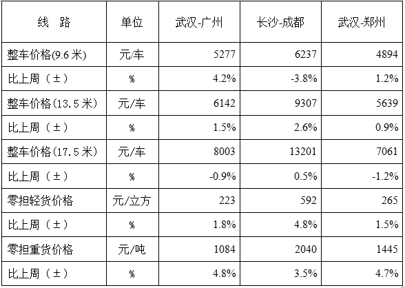 (表1、本周部分线路平均价格及环比情况对比)