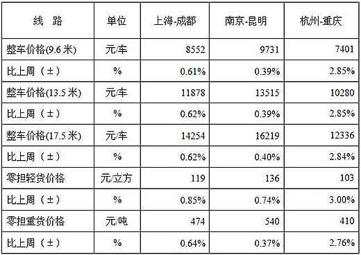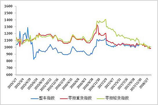 各车型指有不同程度回升,其中零担指数环比回升幅度高于整车指数。其中,整车指数为985.8点,比上周回升0.43%;零担轻货指数回升幅度高于零担重货指数。零担重货指数为984.71点,环比回升0.45%;零担轻货指数为1008.62点,环比回升0.71%。