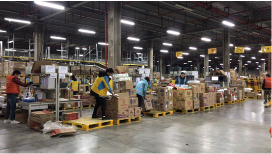 腊八,晚上8点,南京苏宁超级云仓灯火通明,等待包装的商品堆成小山一样,一线物流人员热火朝天的为年货节忙碌着。