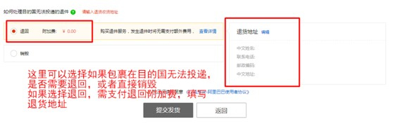 3. 操作流程如下: 针对提供目的国无法投递包裹退回服务的线路,在创建物流单时,卖家需要选择无法投递的情况下包裹的处理意见:1.退回;2.者销毁。