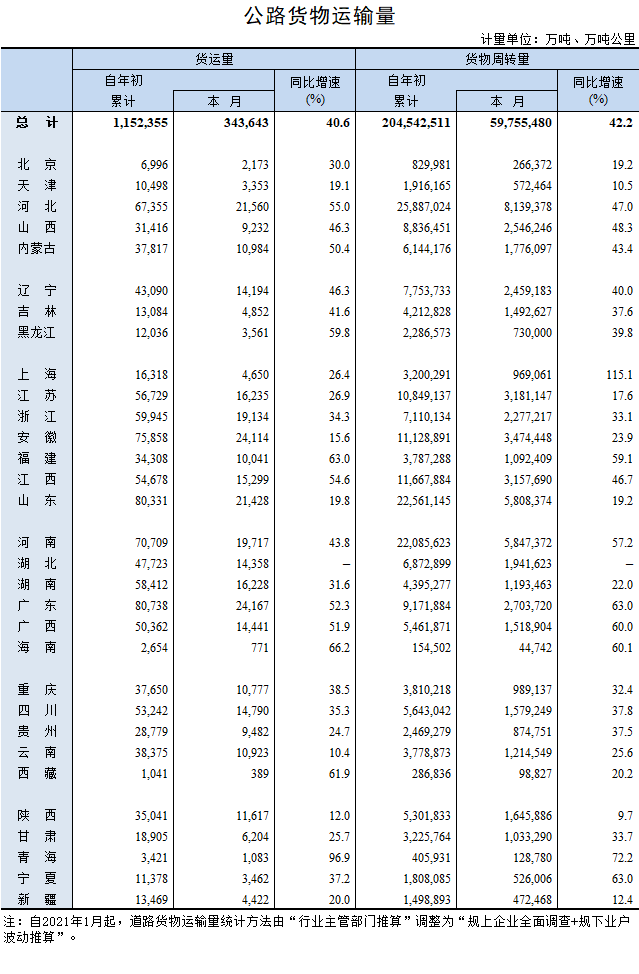 2021年4月公路货物运输量