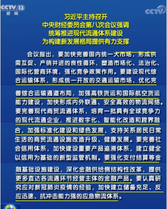 这次会议强调,构建新发展格局,必须把建设现代流通体系作为一项重要战略任务来抓。统筹推进现代流通体系硬件和软件建设,发展流通新技术新业态新模式,完善流通领域制度规范和标准,培育壮大具有国际竞争力的现代物流企业,为构建以国内大循环为主体、国内国际双循环相互促进的新发展格局提供有力支撑。