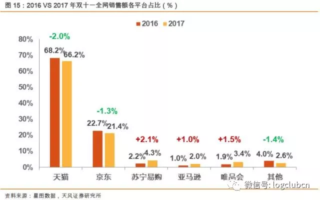 那么,在其他的电商平台中,又是谁夺取了新的份额?我们对比2016年与2017年电商行业的市场份额,发现尽管淘系平台的占比略有走低,但今年,同样地京东份额也下降了1.3%个百分点,苏宁受益于天猫首页的强势导流,成为市场份额上升最多的平台(+2.1%),而同期的唯品会、亚马逊均表现出色。结合我们在上文中提到的家电、3C等产品渗透率加强,阿里巴巴布局苏宁对抗京东的战略成果开始逐步显现。