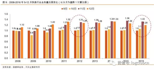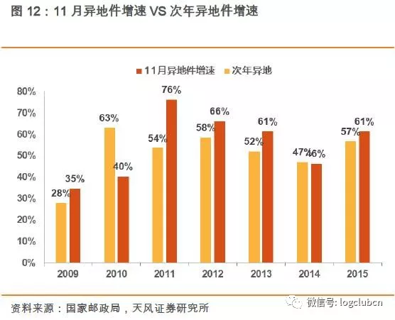 3) 首年11月增速与次年全年业务量增速,基本上次年的增速都会弱于上年十一月的数字。尤其2013年之后,行业整体增速下滑,叠加11月的电商嘉年华活动开始对前后一段时间的需求进行透支,导致11月的单月增速高于次年全年成为常态。