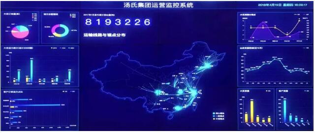 1)数字化运营层面 在汤氏供应链总部,有一张数据大屏,显示着业务范围热力分布以及关键的统计数据,据汤氏供应链副总裁兼予之物联CEO(予之物联为汤氏供应链旗下TSC系统研发公司)王超介绍,汤氏的数字化精细化运营主要体现在两方面: