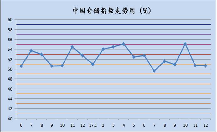 中国物流与采购联合会与中储发展股份有限公司联合调查的2017年12月中国仓储指数为50.7%,与上月持平。各分项指数中,除期末库存指数较上月有所回升外,其余指数均有不同程度的回落。