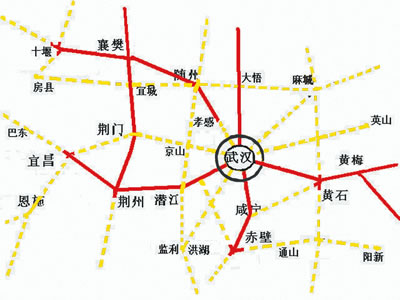 武广客运专线,是我国第一条设计时速高达350公里的铁路客运专线,开通后,从武汉乘火车4小时左右就可直抵羊城,比原来缩短7个小时。“十一五”期间,17个大中型铁路项目将在我省兴建,在6年左右的时间里,我省境内新建铁路总里程将达2512公里,比建国至今湖北省铁路总里程还要多。届时,武汉将成为我国铁路四大枢纽之一,六大客运中心之一,四大机车客车检修基地之一,其客货运能力都将大幅提高,成为国内唯一拥有具备三个特等火车站和两座长江铁路大桥的特大城市。